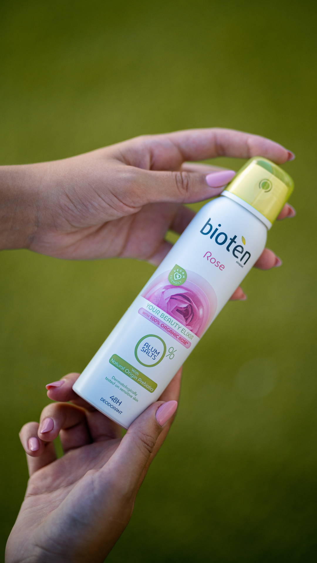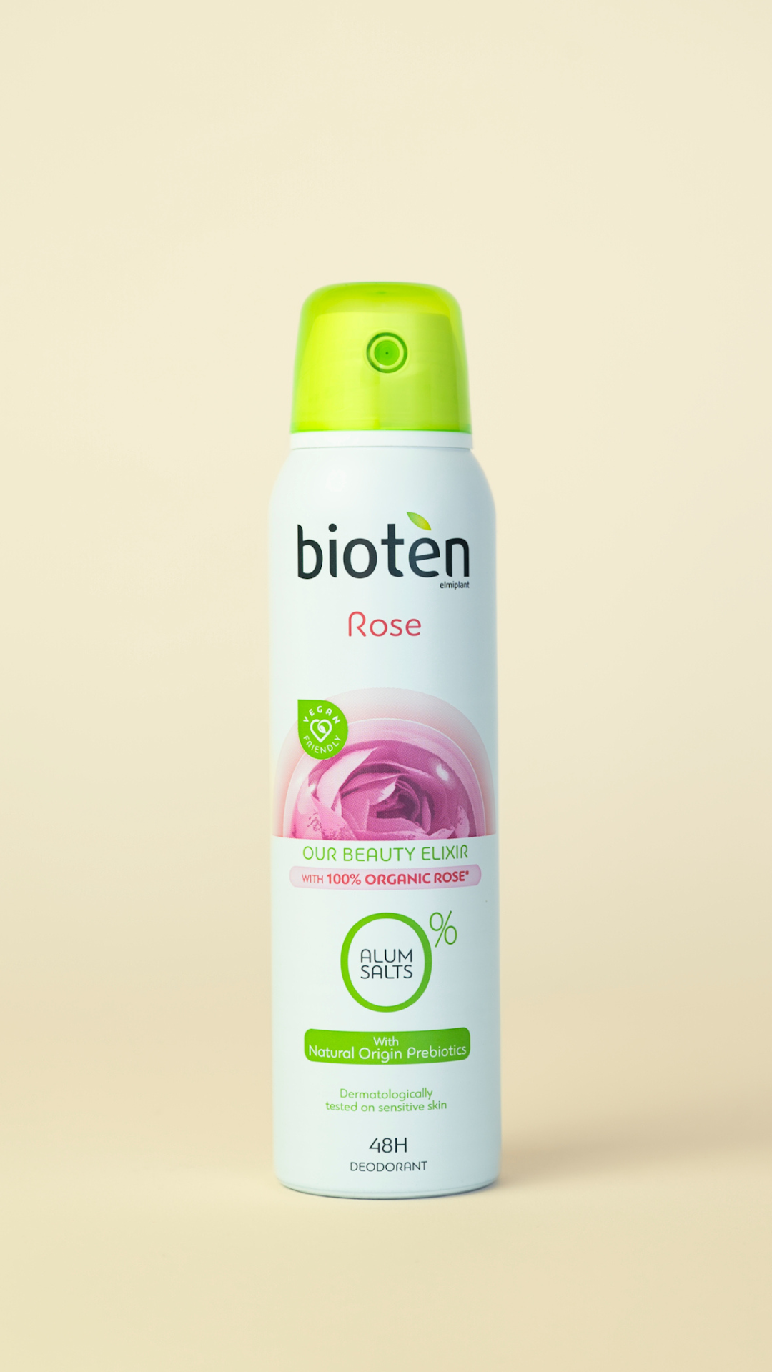 Com extrato de rosa 100% orgânico e prebióticos de origem natural, este desodorizante em spray proporciona 48h de proteção contra odor e transpiração, cuidando da pele das axilas. A sua fórmula anti-manchas garante um efeito 100% invisível, sem resíduos brancos na roupa.