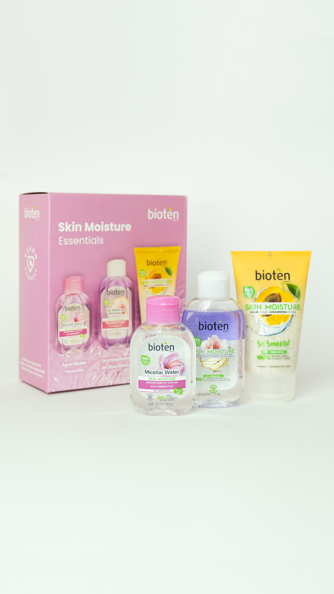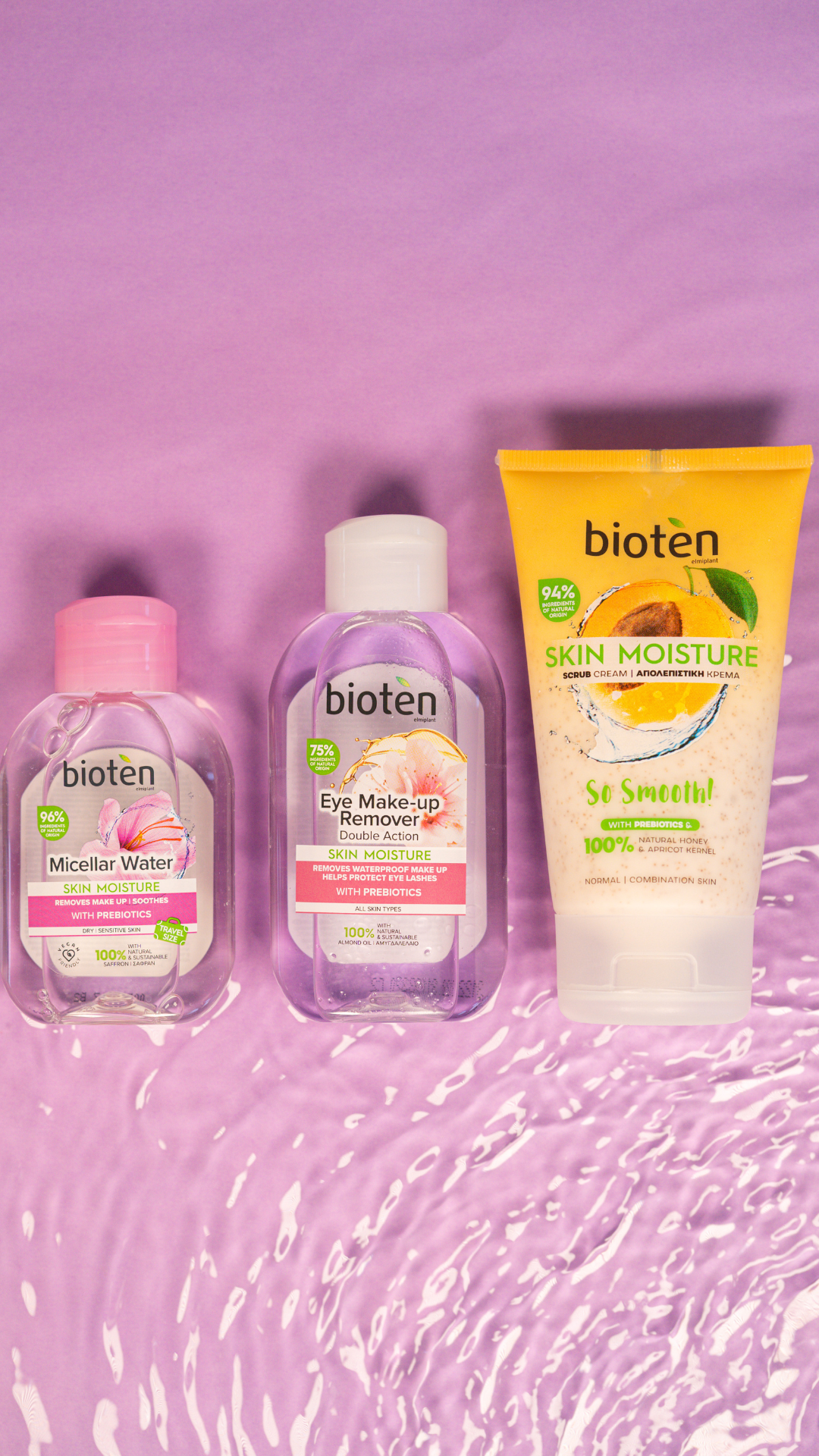 O cuidado essencial para a sua pele em três passos práticos: limpeza, desmaquilhagem e esfoliação suave.